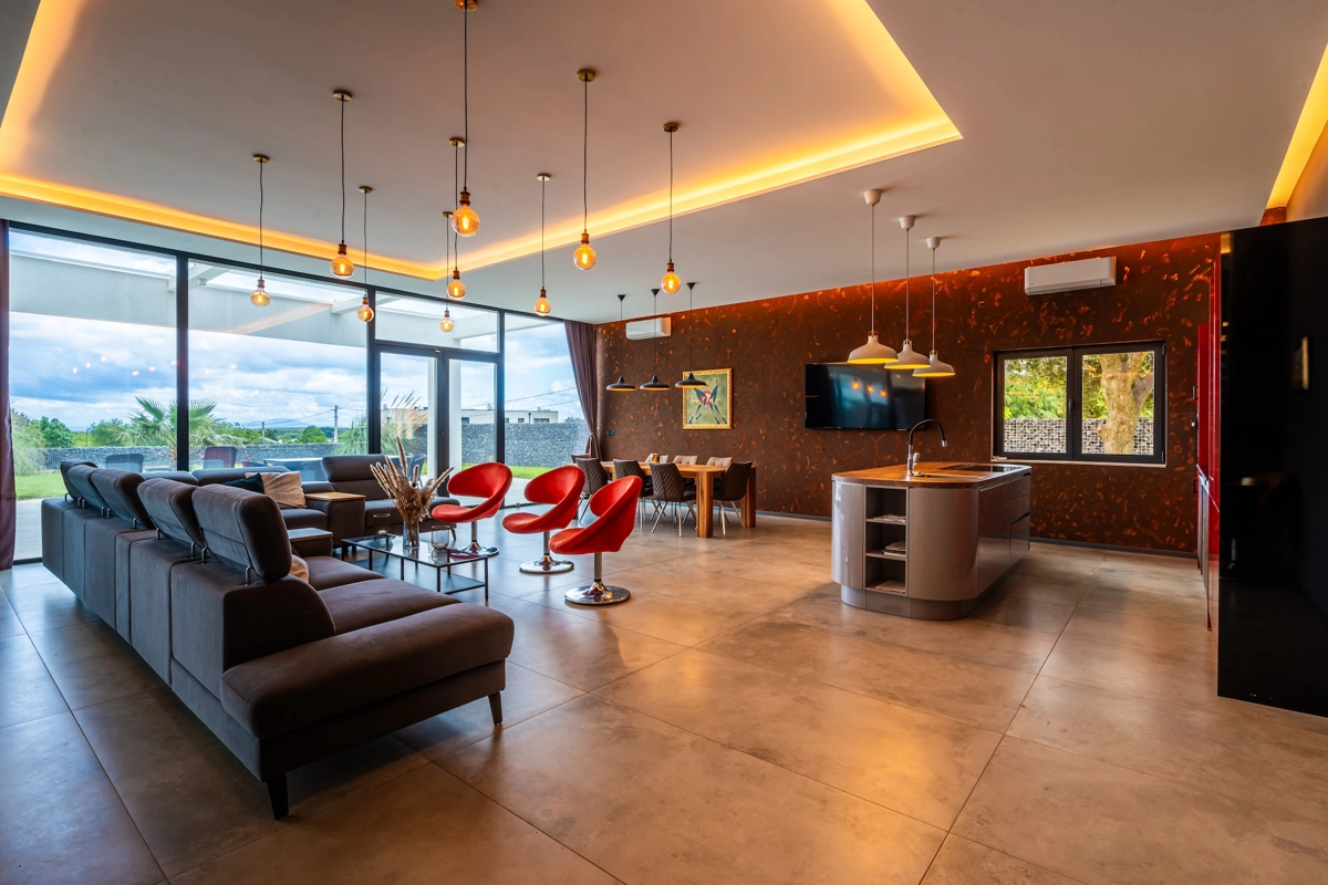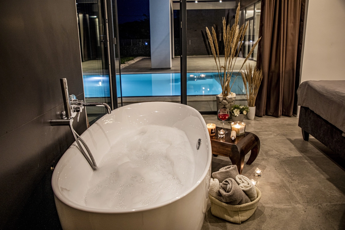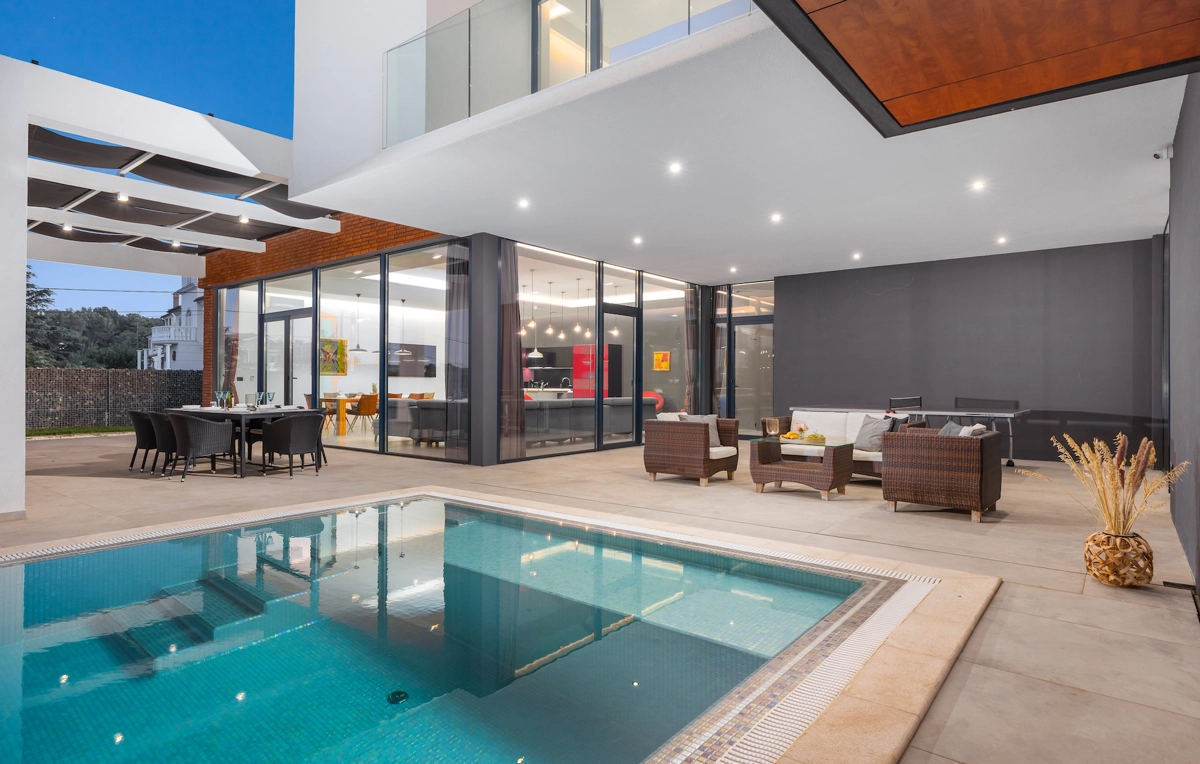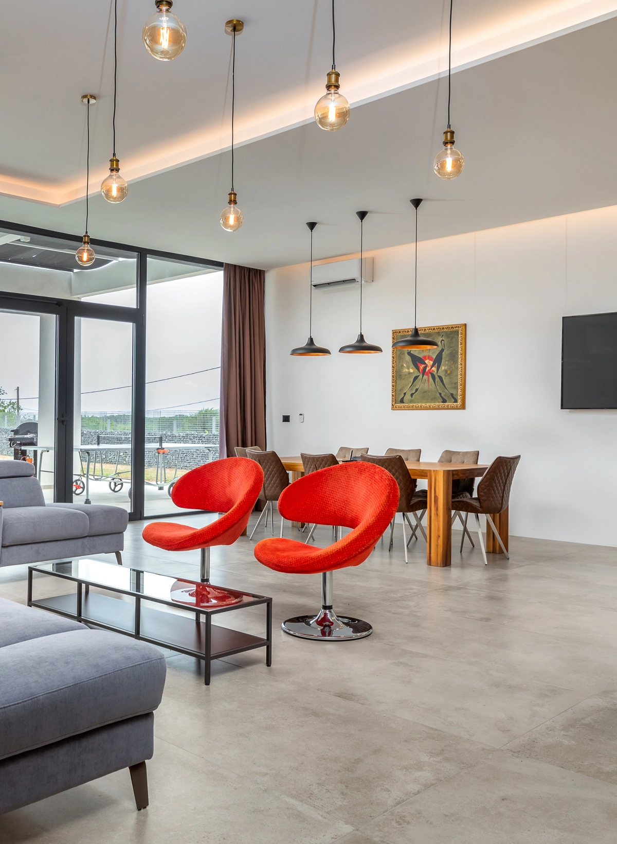 The interior of the villa offers you a modern design while at the same time, creating a warm relaxing atmosphere. The ground floor of the villa houses a spacious enchanting living room and a fully equipped kitchen with dining area. There is also 1 bedroom with direct access to the pool. On the upper floor there are 3 elegantly decorated bedrooms with lots of light and glass surfaces. Each bedroom has its own private bathroom. The exterior of the villa consists of a special pool that will surely be the main attraction for all guests. In addition to the infinity pool, there is also a glass surface in one part through which you can see the interior of the pool. We believe this will be especially interesting for creating the best photos of your well-deserved vacation. Book villa C Istria and spend your stay full of rest, relaxation, comfort and enjoyment!.